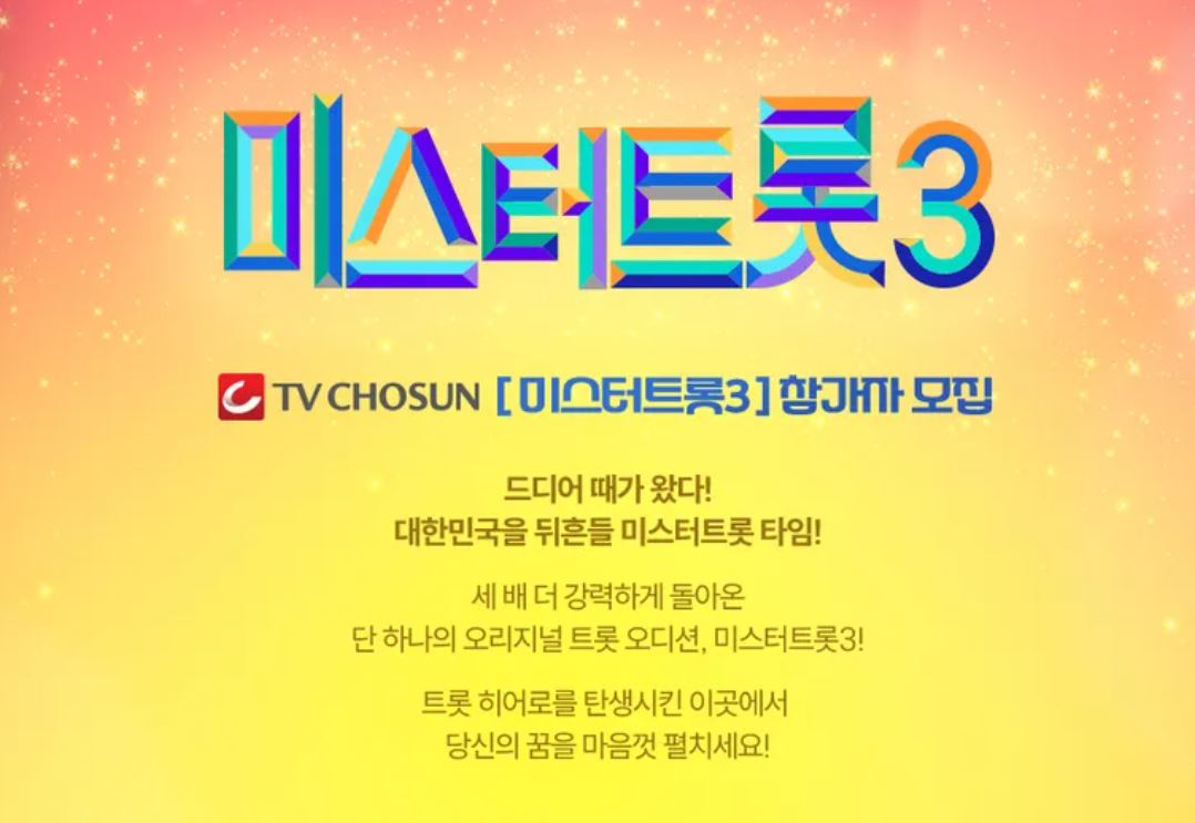 대한민국 국민 중 트롯을 사랑하는 남자라면 누구나 참가 신청 가능하며 미스터트롯 3에 도전하여 나의 가창력과 감동적인 스토리를 마음껏 들려주시기 바랍니다.