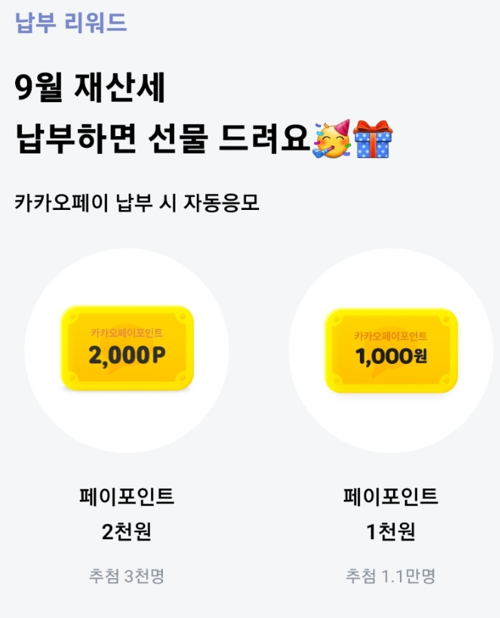 9월은 재산세 2차 납부의 달입니다. 아래 카드사별 혜택을 통해 재산세 내시면서 세금으로 나가는 내 돈 조금이라도 돌려받으시기 바랍니다.