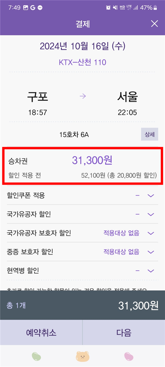 부산(구포)에서 서울 KTX 편도 요금 기준 52,100원에서 40% 할인된 최종 31,300원 요금을 확인하실 수 있습니다.